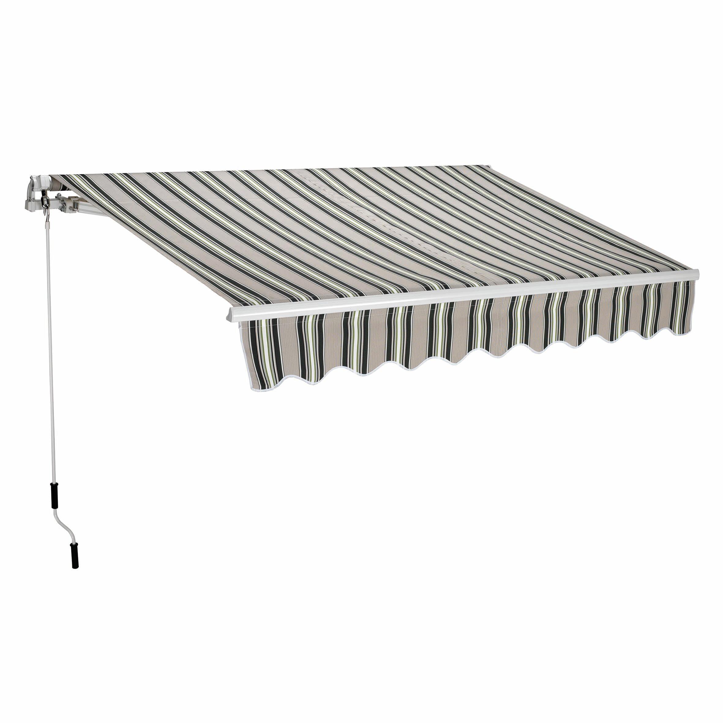 Tenda da sole di colore verde, grigio e bianco a righe con bracci estensibili, non cassonata. Questa tenda manuale crea uno spazio vivibile all'aperto che permette di godersi appieno il terrazzo proteggendo dal sole. Dimensioni: 2,5 x 2 metri.
