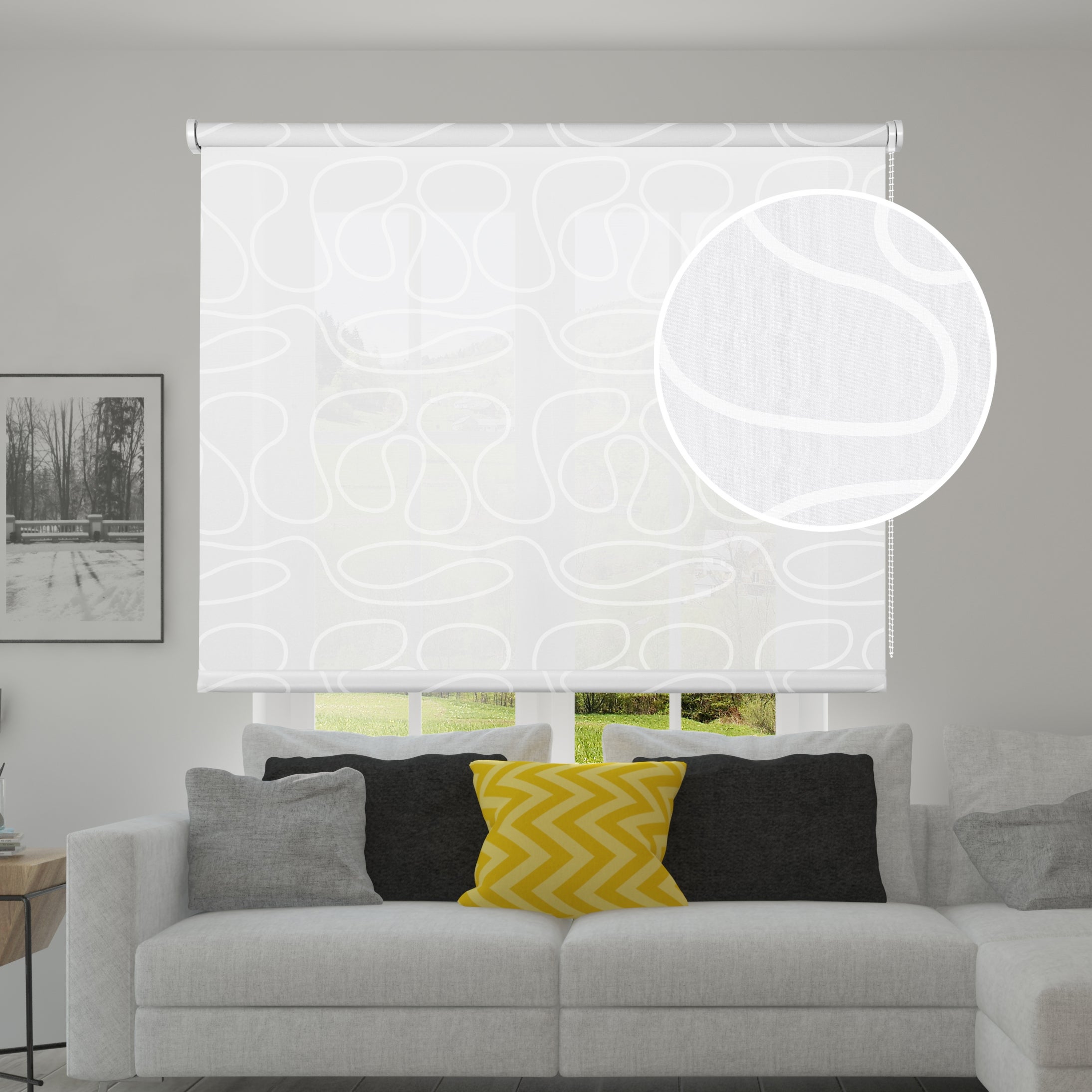 Tenda a rullo in tessuto leggero e decorativo. Fa trasparire la visuale esternae lascia passare la luce, conferendo luminosità e stile.