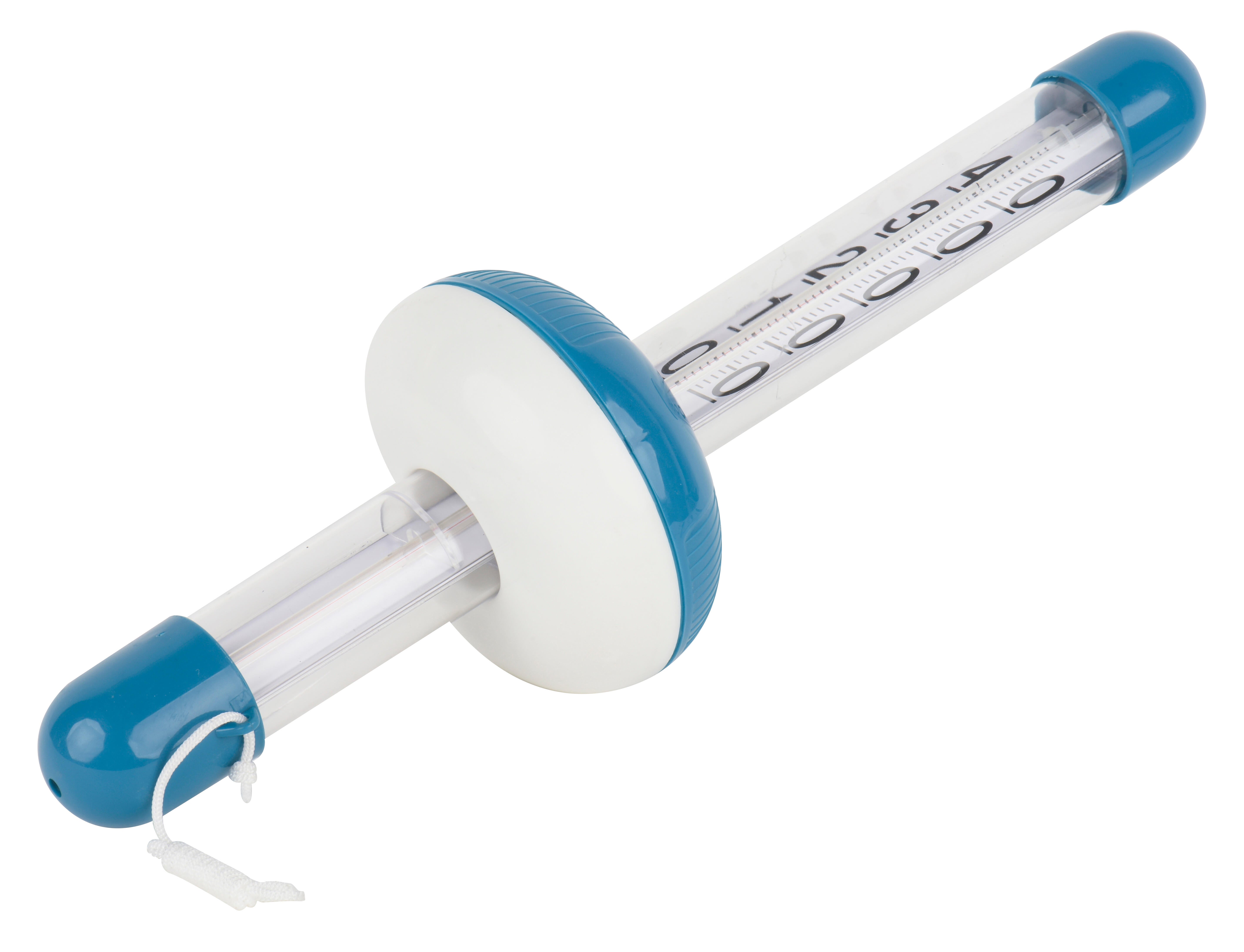 Termometro per la misurazione della temperatura dell'acqua della piscina. Le sue grandi cifre e lo stelo in vetro lo rendono facile da leggere e la sua corda consente di fissarlo facilmente al bordo della piscina