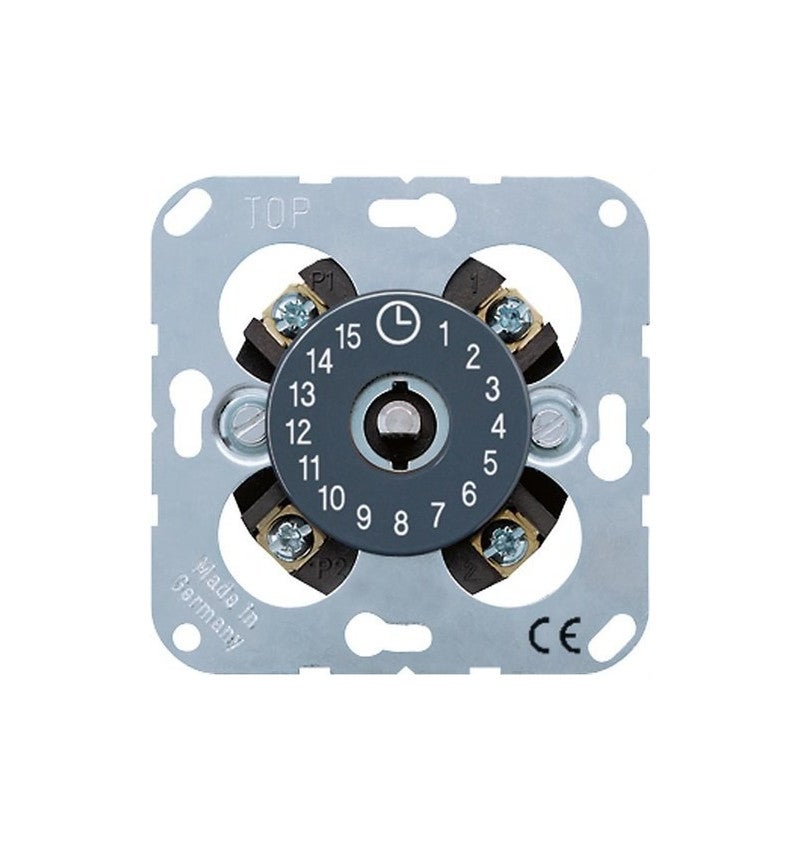 Timer 16AX 250V, massimo 15 minuti. Connessione a vite per cavi fino a 4 mm², fissaggio tramite vite senza griffe di fissaggio, con anello di scala. Tolleranza di tempo ± 10, ripristinabile girando in senso antiorario.