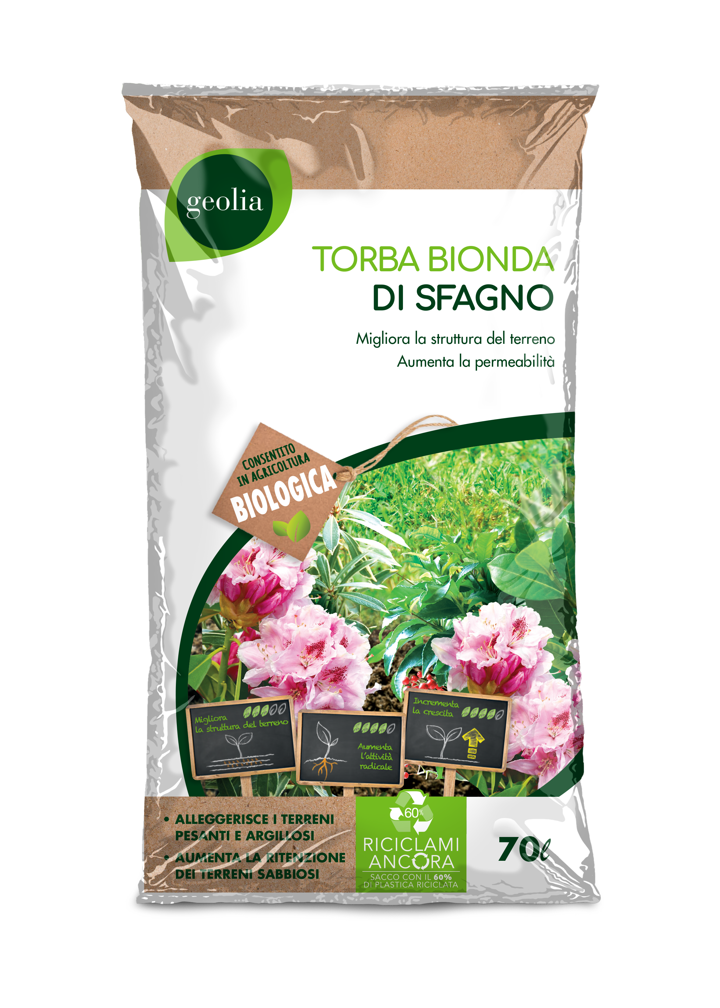 La Torba Bionda di Sfagno Geolia apporta materiale organico alla struttura del suolo. In particolare la torba bionda alleggerisce i terreni pesanti e argillosi, mentre aumenta la ritenzione di quelli sabbiosi.