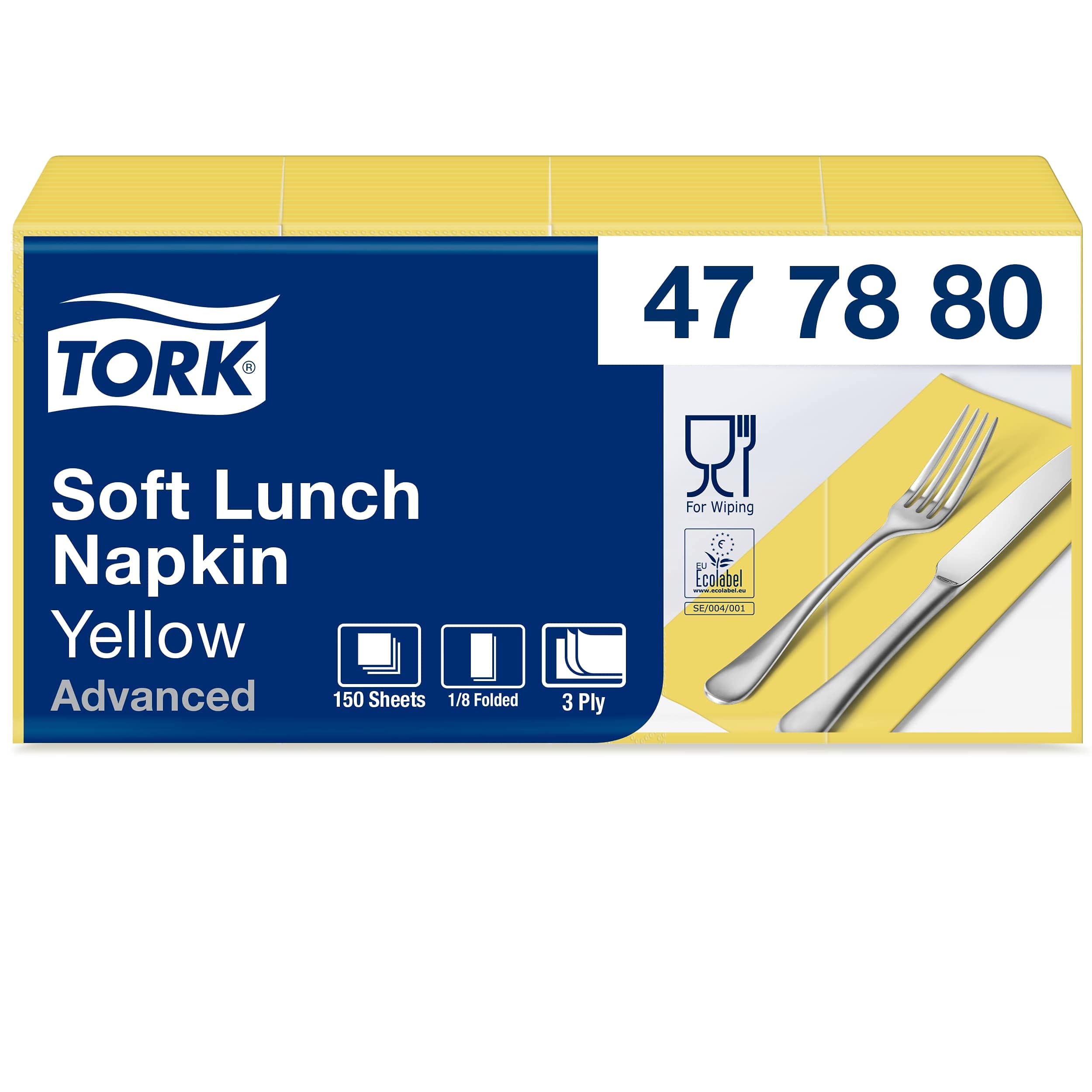 Tork 477880 Tovagliolo Lunch Soft giallo (piegato in 8) Advanced, 3 veli, 10 pacchi x 150 tovaglioli (1500 pz), 33 cm (lungh.) x 32,6 cm (largh.)