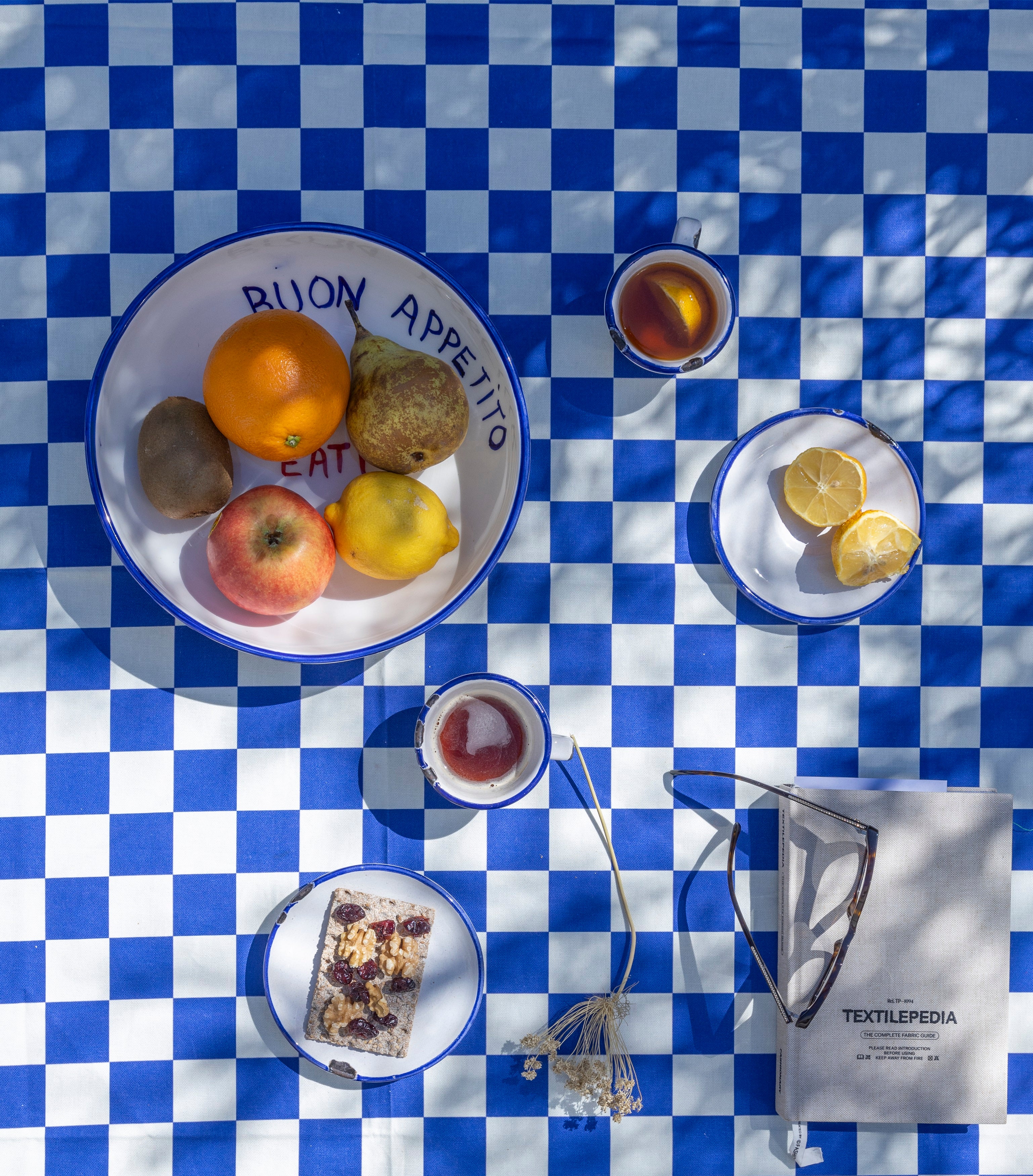 Tovaglia realizzata con bordino a contrasto in tessuto certificato OEKO TEX 100% cotone, stampata con coloranti reattivi per una durata massima.
