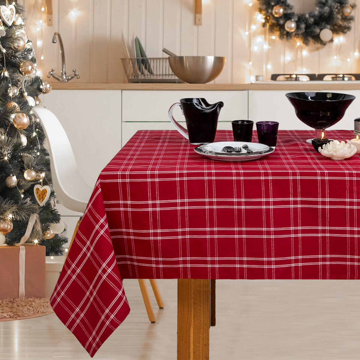 Tovaglia antimacchia in fantasia natalizia scozzese rossa e bianca, rettangolare nella misura 140x230 in cotone e polestere resistente e morbida al tatto