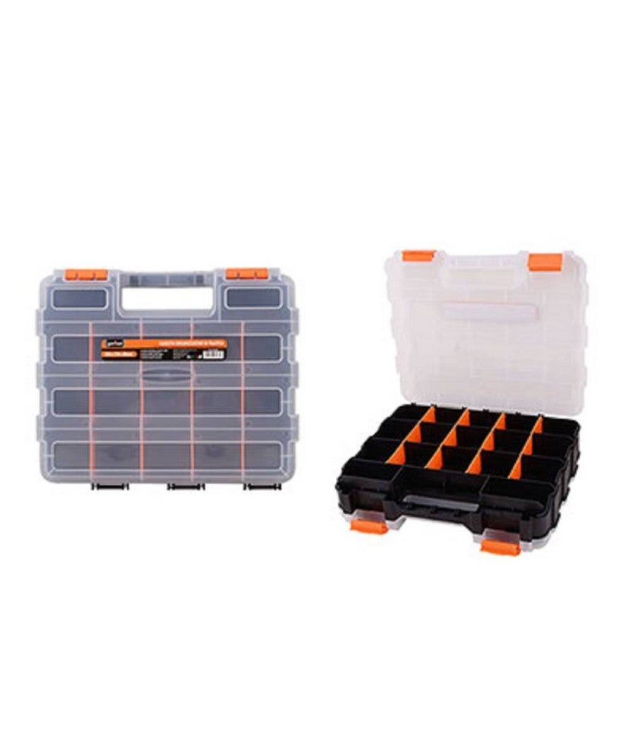 Cassetta porta attrezzi in plastica con doppia apertura dotata di 34 scomparti suddivisi in 17 da un lato e 17 dall'altro con lati removibili per poter regolare gli spazi e poter inserire attrezzi di dimensioni diverse. Grazie alla sua chiusura sicura potrete trasportare tranquillamente viti, bulloni e altro senza correre il rischio che si mescolino tra di loro.Dimensioni: 320x270x80 mmMateriale: PlasticaDimensioni vani: 6x6.5x3 cm – 9.5 x 4 cm