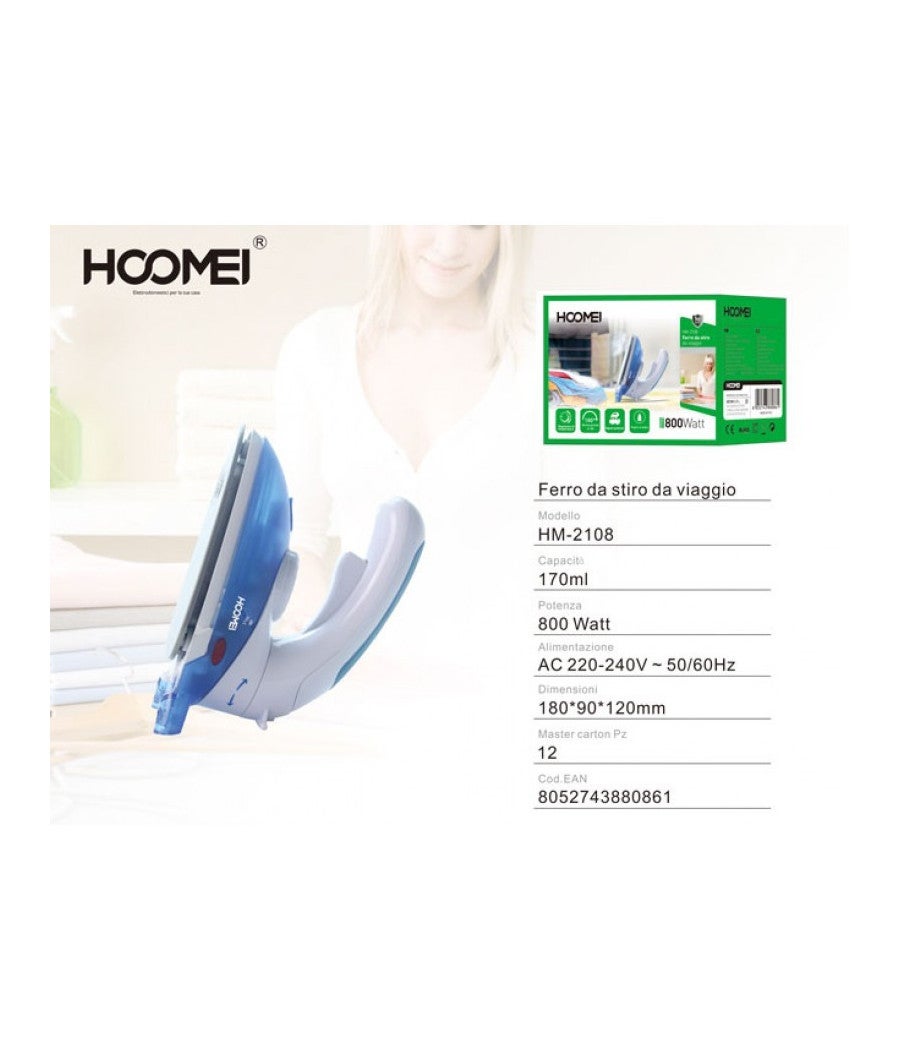 Ferro da Stiro Vapore Viaggio 800W Piastra Teflon con Manico Reclinabile HM-2108Il Ferro da Stiro Vapore Viaggio 800W con Piastra in Teflon e Manico Reclinabile HM-2108 è l'accessorio ideale per garantire prestazioni eccellenti e praticità durante i viaggi o in spazi ridotti.Caratteristiche Principali:Potenza 800W: Grazie alla sua potenza di 800W, questo ferro da stiro assicura una rapida e efficace stiratura dei tuoi capi, anche durante i viaggi.Stiratura a Secco e a Vapore: Con la sua versatilità, questo ferro da stiro ti consente di scegliere tra la stiratura a secco o a vapore, in base alle esigenze dei tuoi indumenti.Piastra in Teflon: La piastra rivestita in Teflon garantisce una scorrevolezza ottimale sul tessuto, riducendo al minimo il rischio di aderenze e danni agli indumenti.Termostato Regolabile: Il termostato regolabile ti permette di impostare la temperatura in base al tipo di tessuto da stirare, garantendo risultati impeccabili senza rischi di bruciature.Colpo Vapore 0.3 g: Il colpo di vapore con erogazione di 0.3 g assicura una potente azione anti-piega, per una stiratura perfetta anche su capi particolarmente difficili.Spia di Funzionamento: La pratica spia di funzionamento ti indica quando il ferro è acceso e pronto per l'uso, per una gestione sicura ed efficiente.Manico Reclinabile: Il manico reclinabile rende questo ferro da stiro ancora più compatto e facile da trasportare, ottimizzando lo spazio durante i tuoi viaggi.Aggiungi praticità e prestazioni al tuo viaggio con il Ferro da Stiro Vapore Viaggio 800W Piastra Teflon con Manico Reclinabile HM-2108. Grazie alla sua potenza, versatilità e design compatto, sarà il compagno perfetto per garantire capi impeccabili ovunque tu vada.