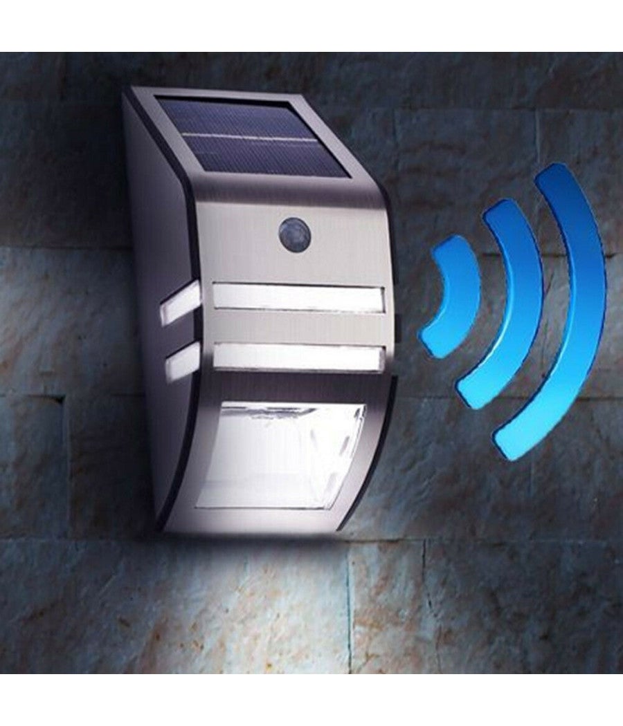 Lampada Solare Faro LED Parete Esterno Giardino Faretto con Sensore di MovimentoIllumina gli ambienti esterni di casa tua con la nuova lampada da parete ad energia solare e con sensore di movimento. Questa bellissima lampada da esterno è dotata di sensore di movimento che attiva la luce per 20 secondi non appena viene rivelato un movimento, creando la giusta illuminazione ideale per farsi strada attraverso il giardino. Fornita di pannello solare incorporato in modo che possa caricarsi alla luce durante il giorno. Ciò garantisce notevoli risparmi energetici ed evita complicati attacchi elettrici durante l'installazione. Facile da installare alle pareti esterne grazie al kit di montaggio incluso nella confezione.SPECIFICHE PRODOTTO:Dimensioni: 17 x 8 x 3 cmMateriale: acciaio Colore: SilverNecessita di Montaggio: SiAlimentaziuone: Energia SolareSensore di movimento che attiva la luce al passaggio di persone per 20 secondiTipologia Luce: LEDNumero di LED: 2Potenza: WattBatteria: 500mAh incorporato ricarica solareDurata del LED: 50.000 oreKit di montaggio incluso nella confezioneCONTENUTO DELLA CONFEZIONE:1 x Lampada Solare Faro LED Parete Esterno Giardino Faretto con Sensore di Movimento