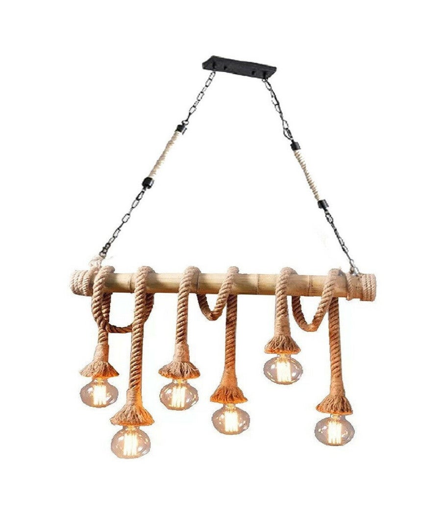 Lampadario a sospensione dal design rustico con corda in canapa perfetto per arredare casa con originalità. Dotato di 6 portalampada con attacco E27, perfetto per casa, bar, pub, ristoranti, ecc.Specifiche:Attacco: E27Numero portalampada: 6 (lampadine non incluse)Dimensione: 600x800 mmMateriale: Legno, corda di canapa e Metallo