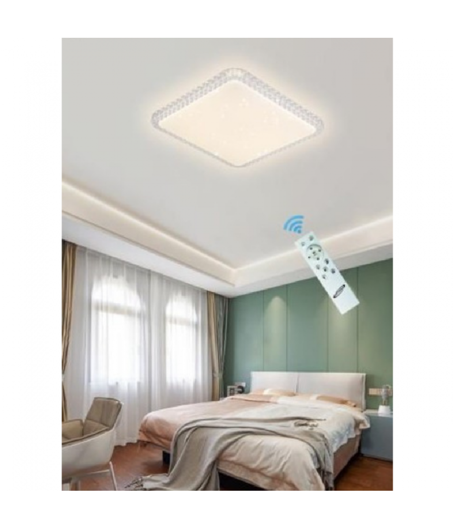 Elegante e moderno lampadario a plafoniera LED. Superfice che esalta il design. I suoi LED durano a lungo e diffondono una luce omogenea permettendoti di risparmiare energia. Perfetta per illuminare stanze, camere da letto, corridoi, ma anche locali commerciali come studi, uffici, bar. Potenza 24W, 48W a seconda del tono di luce. La plafoniera è dotata di tre accensioni:Luce Calda 3000K, potenza 24W, Lumen 1920LmLuce Naturale 4000K, potenza 48W, Lumen 3840 LmLuce Fredda 6500K, Potenza 24W, Lumen 1920 LmCorpo realizzato in ferro e acrilico effetto cristallo, dimensioni: 430x430 mm. Ambiente interno IP20, protezione contro le sovratensioni: 1.5 KV. Dotata di telecomando per il controllo remoto, connessione Bluetooth, funzione Timer, cambio tono di luce, dimmerabile. Installazione semplice tramite tasselli e viti, senza bisogno di staffe.Tripla accensione: Possibilità di scegliere il tono di luceModalità 1: La luce è accesa totalmenteModalità 2: La luminosità della luce risulta dimezzata rispetto alla modalità 1.Modalità 3: La luminosità della luce è minore (luce soffusa)Funzioni SmartDimmer: Luminosità regolabile con telecomando.La plafoniera è dotata di TIMER che permette lo spegnimento entro 30 sec.Materiale AcrilicoCRI/Ra 80Durata 20.000 hFrequenza 50-60 HzTensione AC 220-240VDimmerabile SiAmbiente InternoFascio Luminoso: 120°