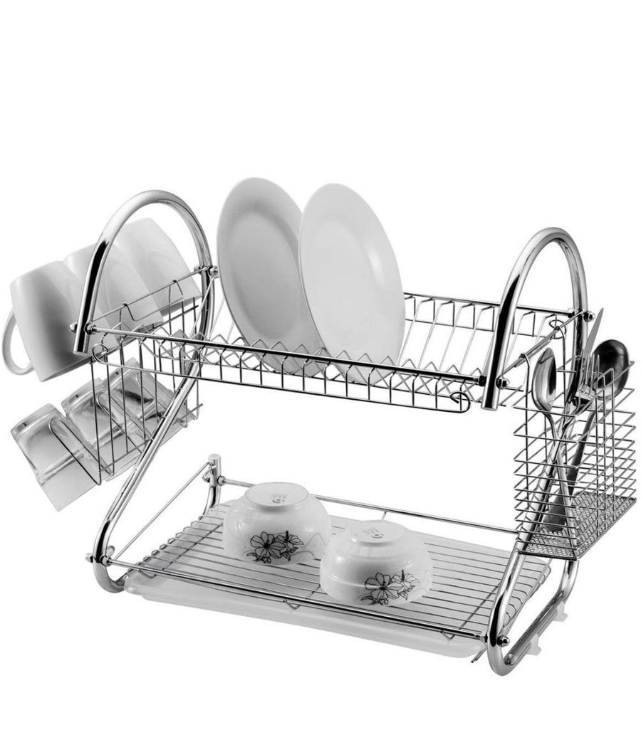 Trade Shop - Scolapiatti 2 Ripiani In Metallo Cromato Con Vassoio Salvagoccia E Portaposate -