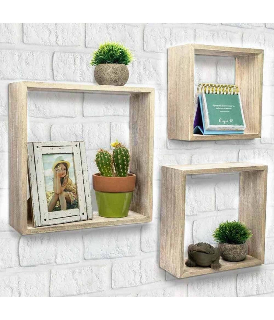 Set 3 Mensole da Parete Moderne Design Cubo Mensola Scaffale in Legno MDF BeigeDona un tocco di stile e design all'arredamento di casa tua con questo bellissimo set di mensole a cubo. Ogni mensola è realizzata interamente in legno mdf in un elegantissimo colore naturale effetto legno ed ognuna è fornita di 2 ripiani d'appoggio uno all'interno della mensola e uno sulla parte superiore. Le mensole possono essere installate alla parete come meglio credi, creando tantissime combinazioni diverse a seconda del proprio gusto personale, inoltre grazie ai pratici fori presenti sul retro di ogni mensola sarà un gioco da ragazzi istallarle al muro. Dal design moderno e minimale ma molto particolare, questo bellissimo set è composto da 3 mensole a forma di cubo in 3 dimensioni diverse, perfette per valorizzare oggettistica e complementi d'arredo oltre a rendere unico l'arredamento di casa tua. I materiali utilizzati e la loro versatilità rendono il set di mensole un complemento d'arredo di altissima qualità perfetto per chi ama i complementi di design e per chi ama curare l'arredo del proprio appartamento in ogni dettaglio.SPECIFICHE PRODOTTO:Dimensioni: 25 x 25 x 9 - 20 x 20 x 9 cm - 15 x 15 x 9 cmPortata massima carico: 5KgMateriale: Legno MDFColore: Legno naturaleNecessita di Montaggio: SiFissaggio alla pareteNumero di ripiani per singola mensola: 2 ripianiForma: CuboDesign moderno e minimaleCONTENUTO DELLA CONFEZIONE:1 x Set 3 Mensole da Parete Moderne Design Cubo Mensola Scaffale in Legno MDF Beige
