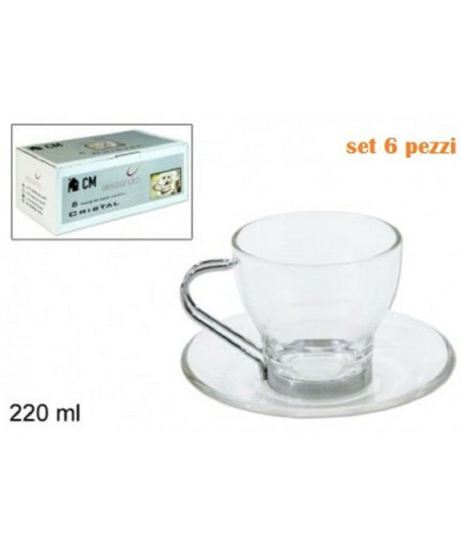 Trade Shop - Set Servizio 6 Tazze Tazzine Caffè In Vetro Trasparente Con Piattino 220ml -