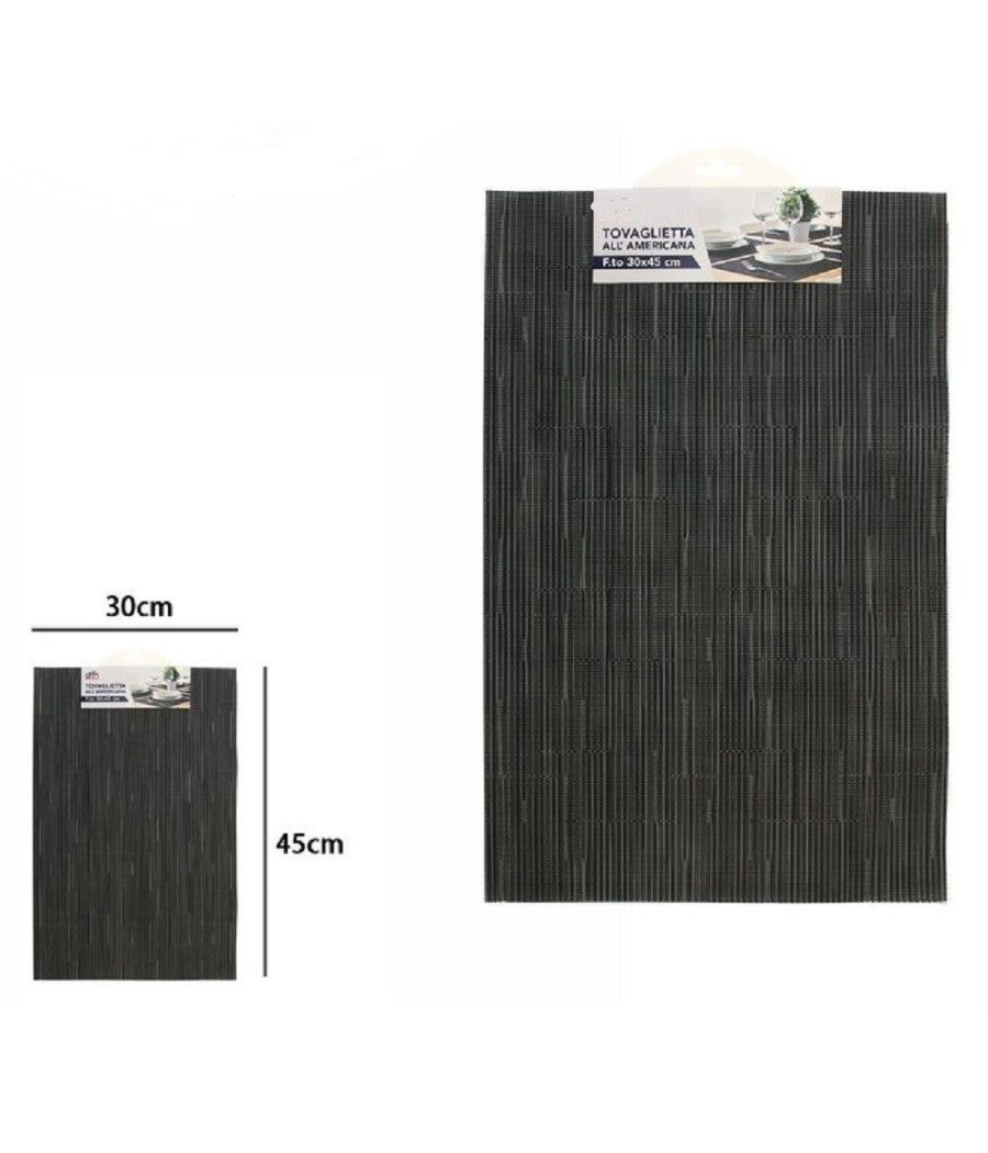 TOVAGLIETTA TOVAGLIETTE AMERICANA COLAZIONE CUCINA 30 X 45 CM GRIGIO SCURO 72293La tovaglietta è un elemento fondamentale per creare un'atmosfera accogliente e funzionale nella tua cucina o nella zona colazione. Con la Tovaglietta Americana per Colazione e Cucina, puoi aggiungere un tocco di stile e praticità alla tua tavola.Caratteristiche Principali:Misura: La tovaglietta misura 30 x 45 cm, offrendo abbastanza spazio per posizionare piatti, tazze e utensili senza sacrificare lo stile.Design: Con un elegante colore grigio scuro, questa tovaglietta si adatta facilmente a una vasta gamma di arredamenti e stili di cucina. Il design americano aggiunge un tocco di tradizione e comfort alla tua tavola.Materiali di Qualità: Realizzata con materiali di alta qualità, questa tovaglietta è resistente e facile da pulire. È progettata per durare nel tempo, mantenendo intatta la sua bellezza anche dopo numerosi utilizzi.Contenuto della Confezione:1 Tovaglietta Americana per Colazione e Cucina grigio scuro (dimensioni 30 x 45 cm)Aggiungi un tocco di classe e funzionalità alla tua tavola con la Tovaglietta Americana per Colazione e Cucina. Sia che tu stia godendo di una tranquilla colazione mattutina o preparando una deliziosa cena, questa tovaglietta sarà sempre al tuo fianco, garantendo praticità e stile. Valorizza ogni momento con la tua famiglia e amici con questa elegante e versatile tovaglietta.