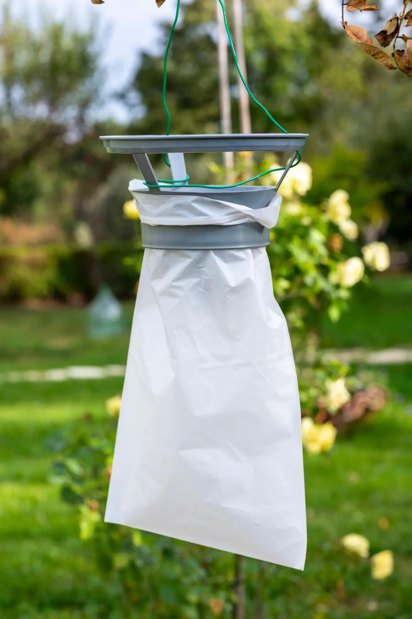 TRAPPOLA PER POPILLIA JAPONICA COMPLETA DI FEROMONI. Trappola a feromoni pronta all'uso per il monitoraggio della popillia japonica AMBIENTI DI UTILIZZO: Collocare la trappola nelle zone perimetrali di orti, giardini, frutteti, vicino a siepi ed edifici VANTAGGI: Semplice da usare- dispositivo per il monitoraggio e la cattura della popillia japonica. È costituito da due erogatori di attrattivi associati ad una trappola ad imbuto con sacchetto di raccolta. La combinazione del feromone sensuale e dell' attrattivo floreale permette la cattura degli individui di entrambi i sessi. Non tossico- sicuro per animali ed ambiente. La confezione contiene 3 sacchetti misura 20x33 biocompostabili per la raccolta degli insetti