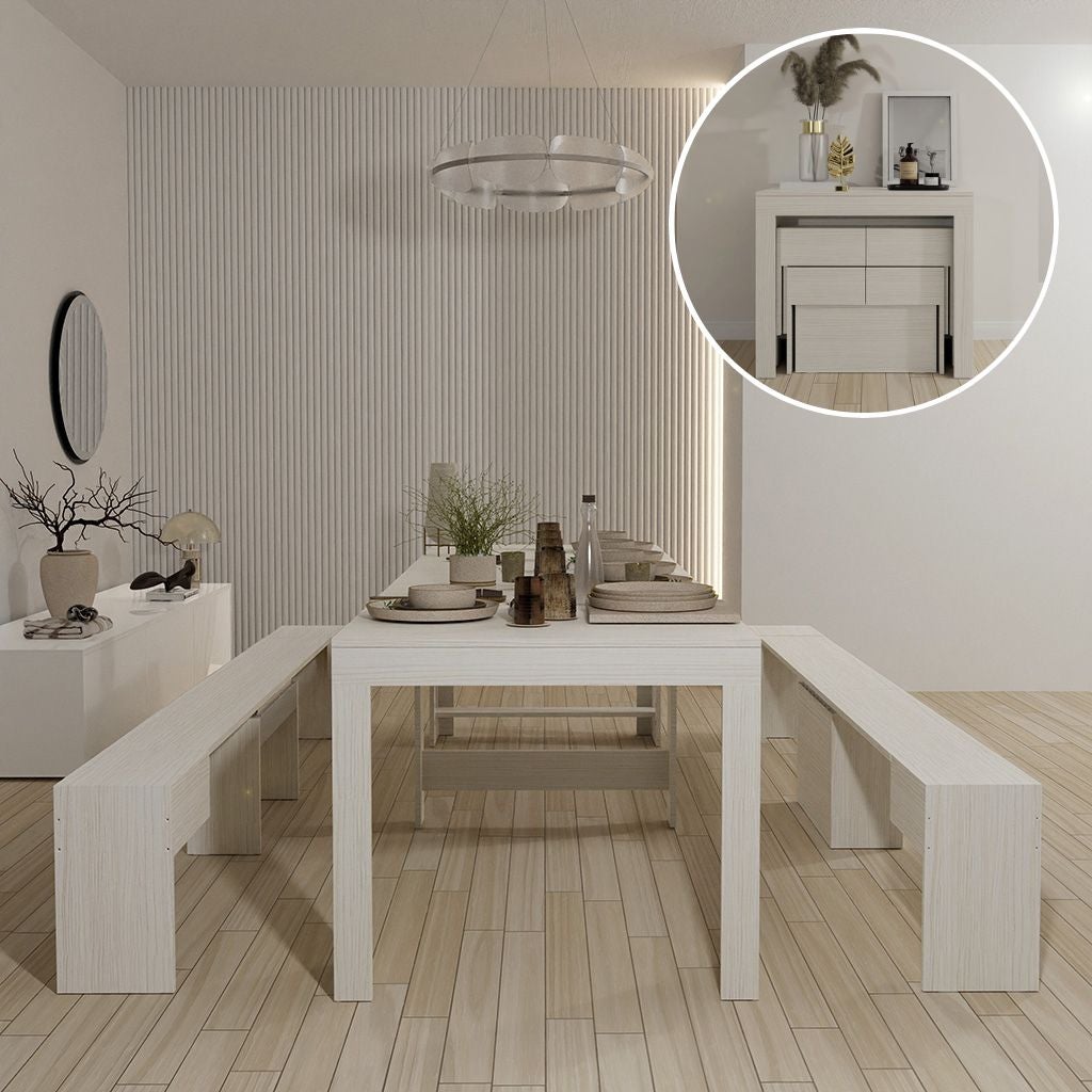 Tutto in uno! Kit tavolo console con 2 panche con porta allunghe (apertura 3 metri)- Bianco