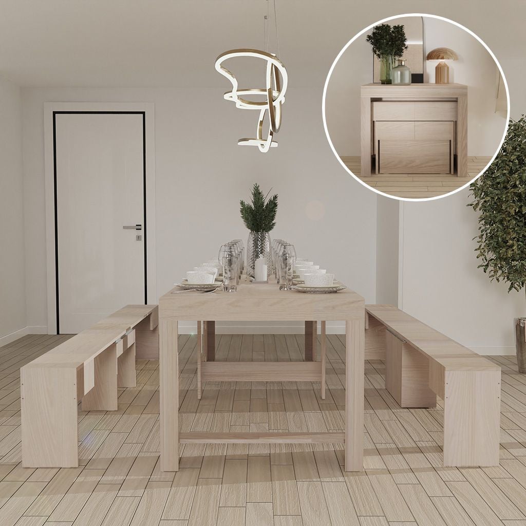 Tutto in uno! Kit tavolo console con 2 panche con porta allunghe (apertura 3 metri)- Legno naturale