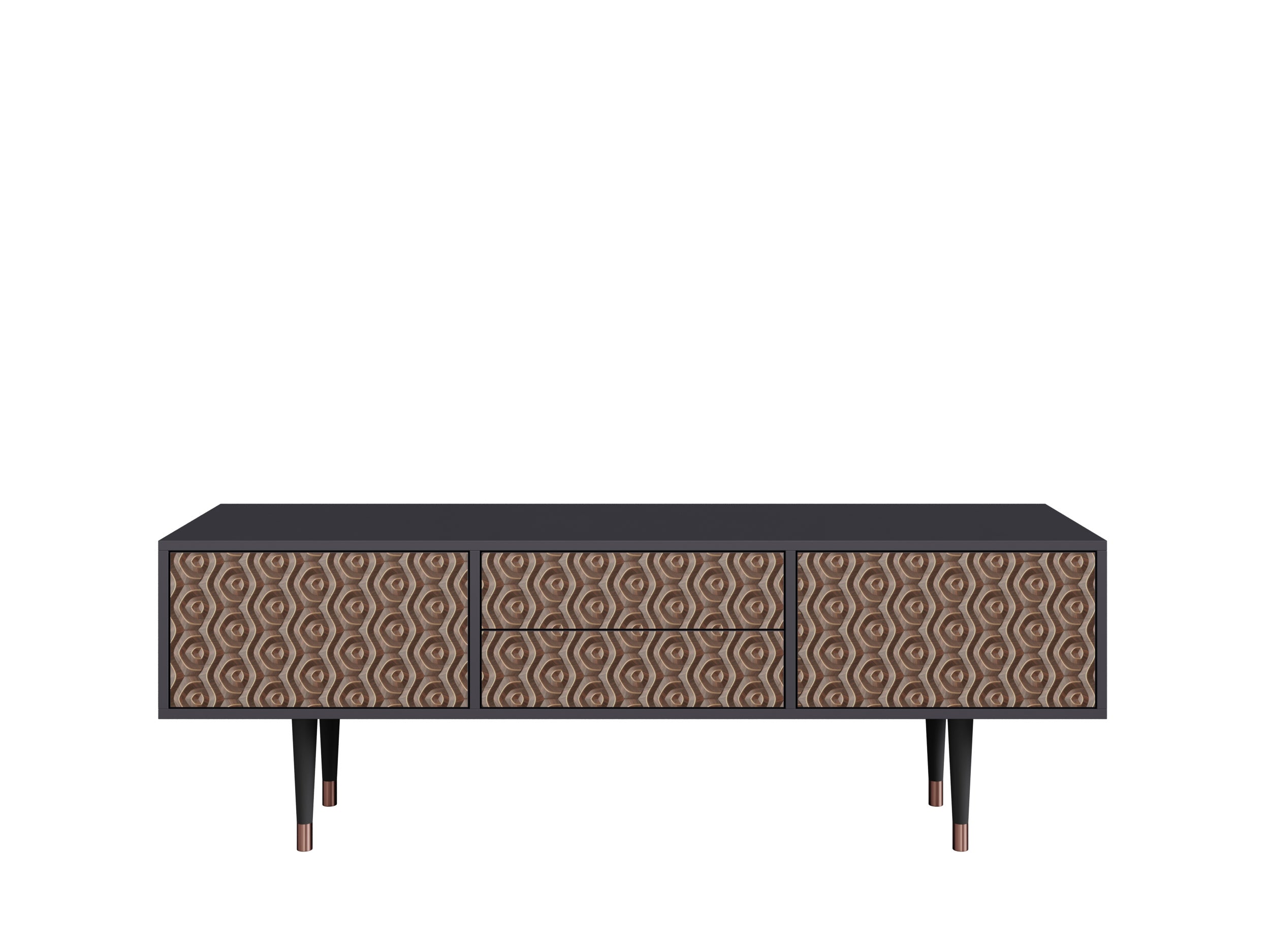 La moderna TV tomba presenta un design unico che valorizza il vostro arredamento e la vostra personalità. Grazie all'innovativa tecnologia di stampa UV, offriamo una vasta gamma di opere d'arte esclusive, perfette per le vostre esigenze. La stampa utilizza inchiostri di alta qualità, caratterizzati da una notevole resistenza sulla superficie del prodotto. Inoltre, l'immagine è protetta da un robusto rivestimento opaco di un noto produttore di vernici ecologiche. La tomba è realizzata con materiali di alta qualità, che riproducono in modo impeccabile le tonalità del noce, del rovere e dell'antarctica. I bordi frontali sono adornati con nastri in rame per la versione in noce e in ottone per quella in rovere, evidenziando l'eleganza di questo mobile. Le gambe della TV tomba sono realizzate in legno naturale, verniciate per abbinarsi al corpo del mobile e protette da anelli in rame o ottone per prevenire danni durante le pulizie. L'altezza della tomba facilita le operazioni di pulizia dell'ambiente, consentendo al vostro robot aspirapolvere di rimuovere la polvere senza difficoltà. Questo mobile è dotato di due ante e due cassetti, che si aprono tramite un sistema push.