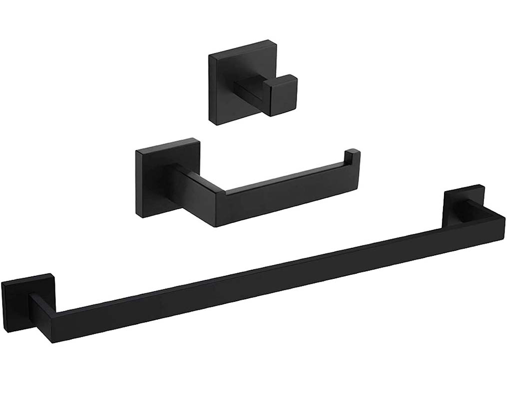 Valaz Accessori da bagno quadrati neri opachi Portasciugamani + gancio + porta carta igienica - 2 ganci