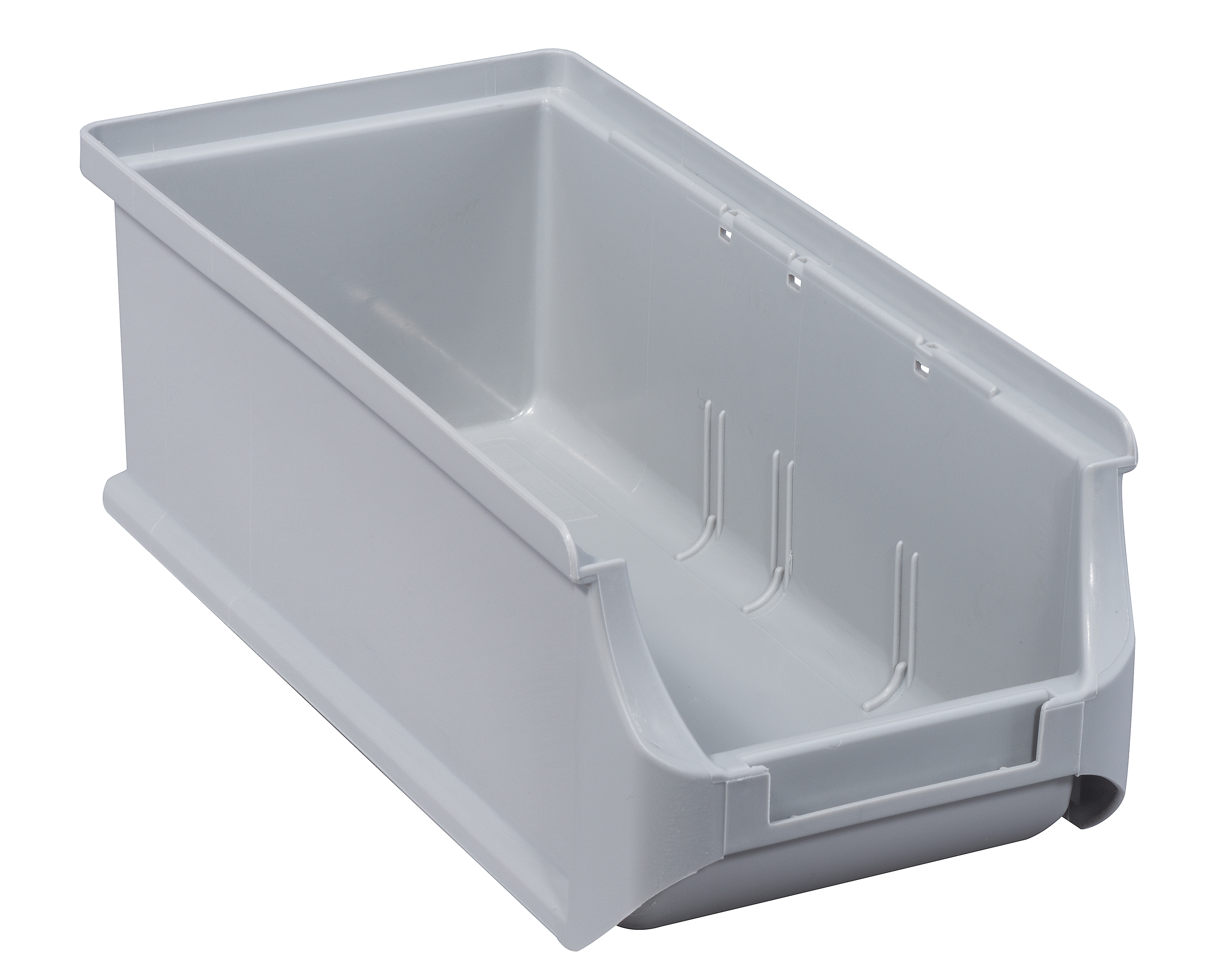 Vaschetta porta minuteria impilabile, realizzata in plastica grigia. Dimensioni: L 10.2 x H 7.5 x P 21.5 cm