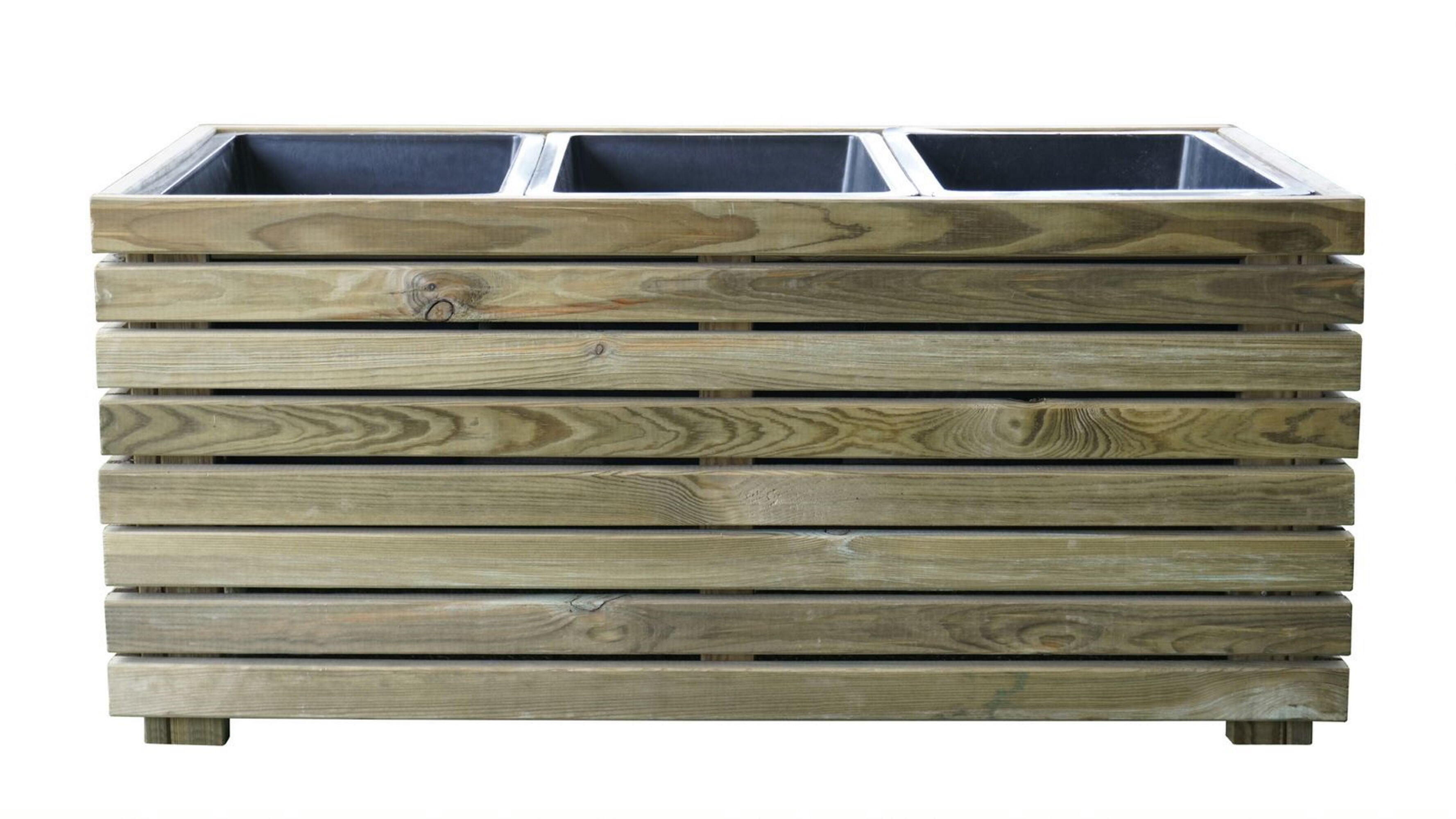 La fioriera Horizon di Cerland è una soluzione versatile e resistente per la coltivazione di piante in terrazzo. Realizzata in legno massello di pino, proveniente da Polonia, e trattata in autoclave di classe III per garantire una lunga durata nel tempo, questa fioriera è resistente alle intemperie e ai raggi UV. Grazie alla sua finitura grezza, la fioriera ha un aspetto naturale che si adatta perfettamente a qualsiasi ambiente esterno. Con una capacità totale di 40,5 litri, la fioriera è dotata di tre vasi in plastica riciclata realizzati su misura per adattarsi perfettamente al suo interno, consentendo di piantare facilmente le tue piante preferite. La certificazione FSC garantisce che il legno utilizzato per la produzione della fioriera proviene da foreste gestite in modo sostenibile.