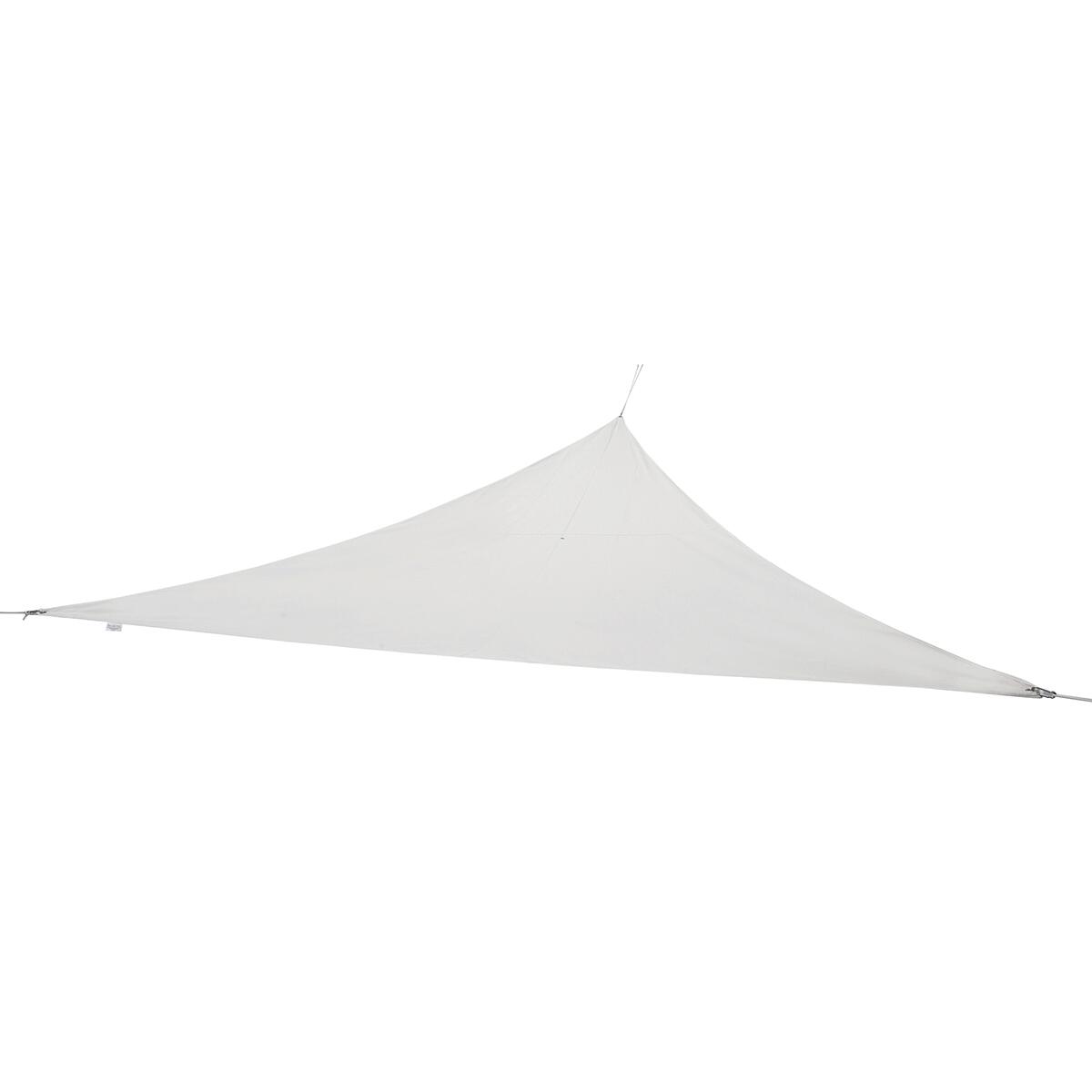 Telo vela ombreggiante, forma triangolare, serie Hegoa di Naterial. Realizzata in poliestere, grammatura 160 g/m², colore bianco. Occhiello, corda, ganci e borsa per il trasporto inclusi. La vela ombreggiante viene venduta con una borsa riutilizzabile. Niente plastica, niente cartone. L'imballaggio è stato ottimizzato per ridurre i rifiuti.