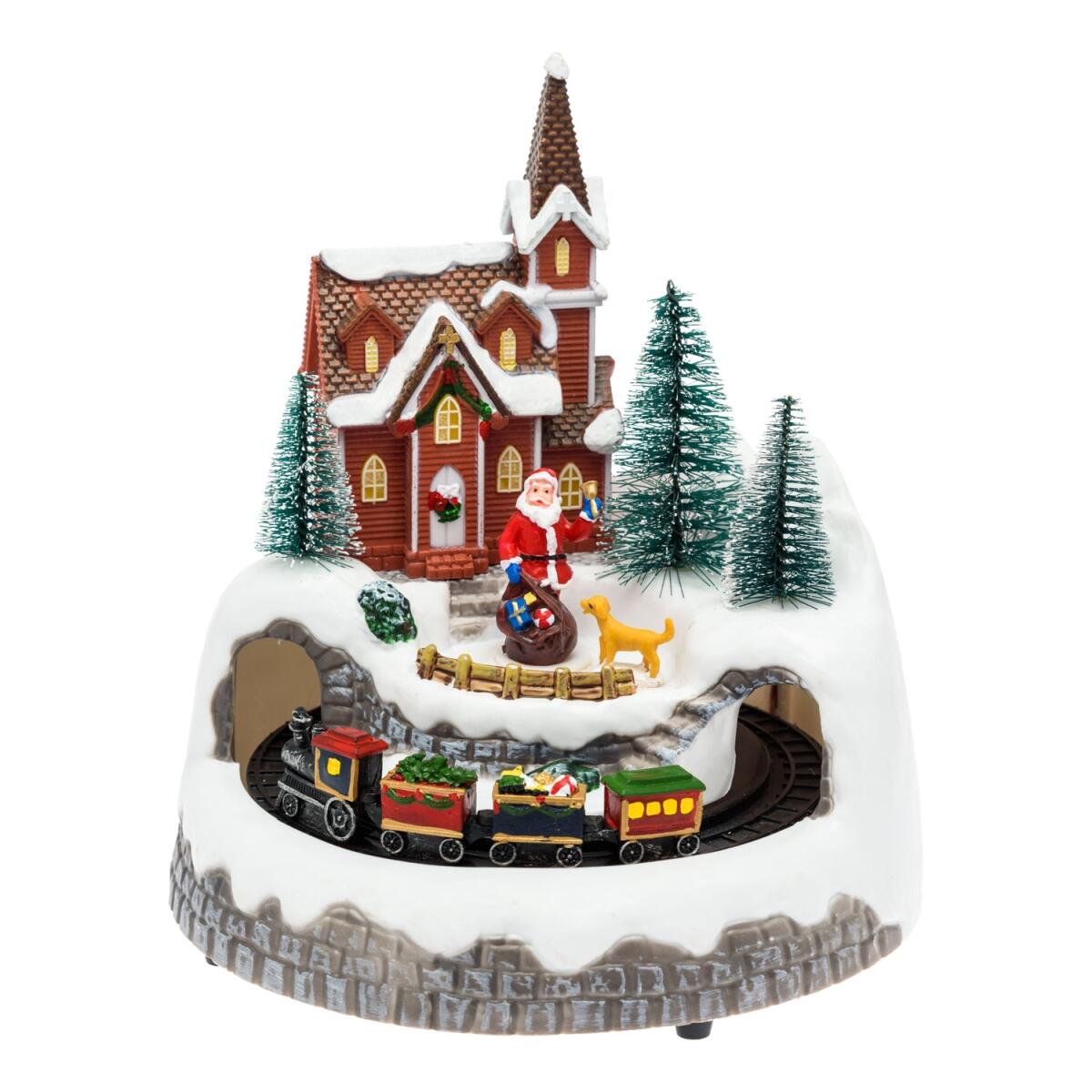 Villaggio H21,5cm Paesaggio con Babbo e Cane, Trenino Rotante in Galleria LED COLOR, Luce Fissa, Musica Natalizia (8 motivi ripetuti in sequenza) Disattivabile con Interruttore On1 (con musica) - Off - On2 (senza musica), a Batteria 3xAA 1,5V (non incluse), Porta Batterie Integrato, IP20 uso Interno, Dimensioni 20x20xH21,5cm, Scatola color (XKC Art. XVG ME65547).