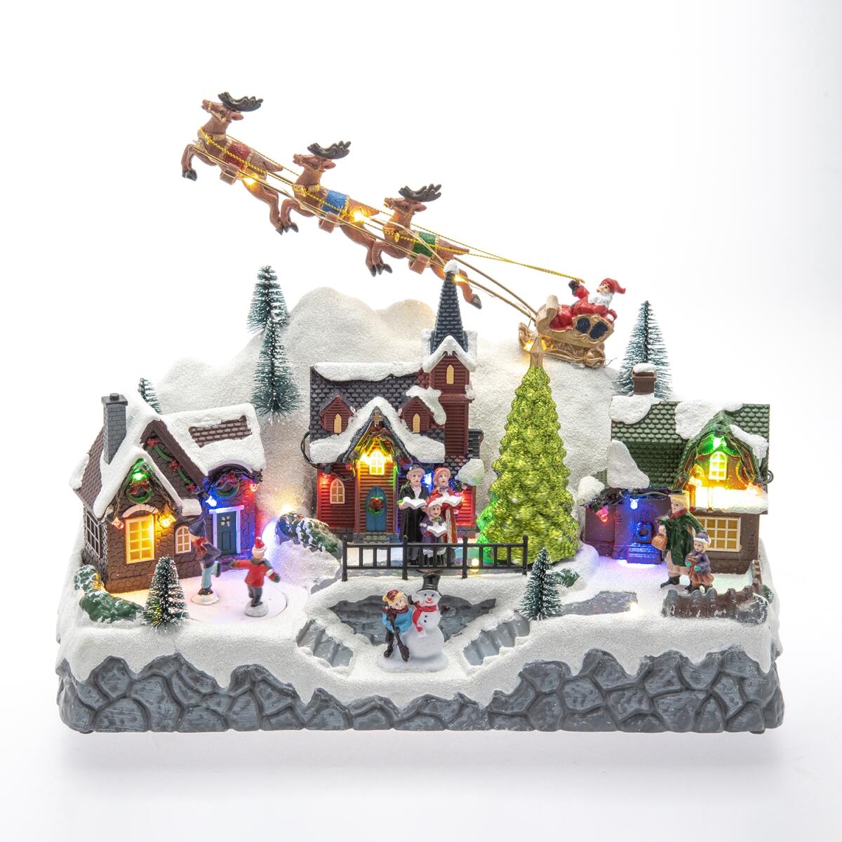 Villaggio 34xH28cm Paesaggio Innevato con Albero Natale e Pattinatori in Movimento (Rotanti), Babbo Natale su Slitta Volante, Illuminazione con Giochi di Luce LED COLOR, Musica Natalizia (8 motivi ripetuti in sequenza) Disattivabile con Interruttore On1 (con musica) - Off - On2 (senza musica), Trasformatore Incluso, IP20 uso Interno, Dimensioni 34x18xH28cm, Scatola color (XKC Art. XVG 006-65511).