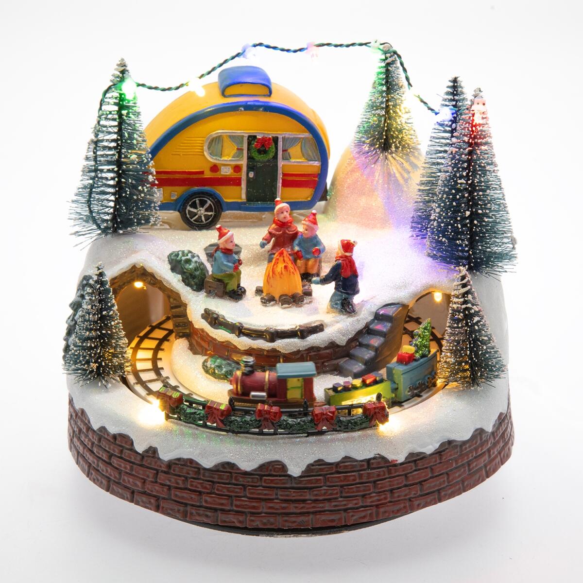 Villaggio 19,5xH16cm Paesaggio Innevato con Roulotte e Falò illuminato, Trenino in Galleria con Movimento, LED COLOR, Luce Fissa, Musica Natalizia (8 motivi ripetuti in sequenza) Disattivabile con Interruttore On1 (con musica) - Off - On2 (senza musica), a Batteria 3xAA 1,5V (non incluse), Porta Batterie Integrato, Predisposizione per alimentazione con Trasformatore Opzionale, IP20 uso Interno, Dimensioni 19,5x18,5xH16cm, Scatola color (XKC Art. XVG 004849-7ASM).