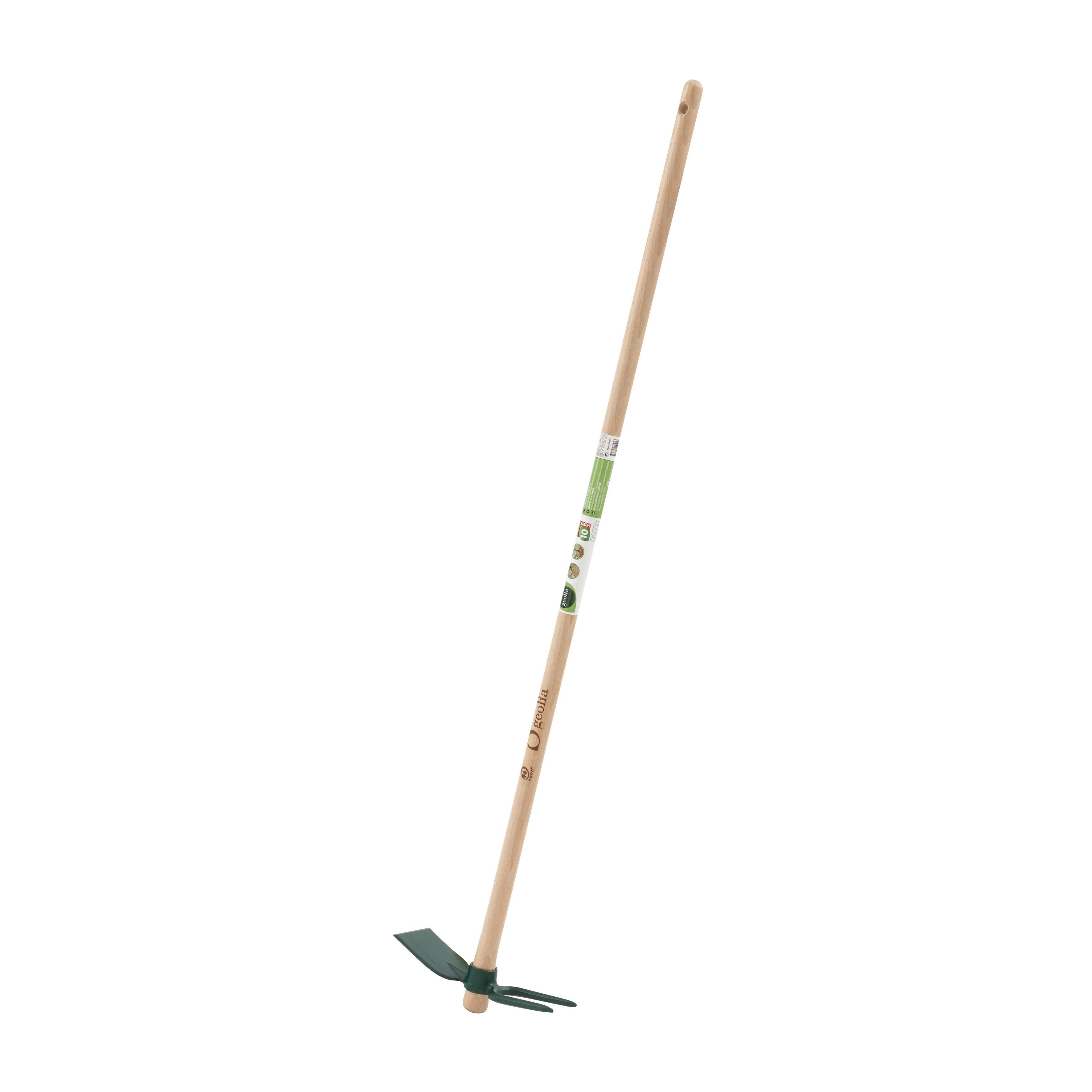Zappetta quadra bidente in acciaio forgiato verniciato, con manico in legno di faggio. Lunghezza del manico: 120 cm. Prodotto certificato PEFC: il legno proviene da foreste gestite in modo sostenibile.