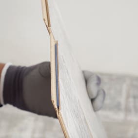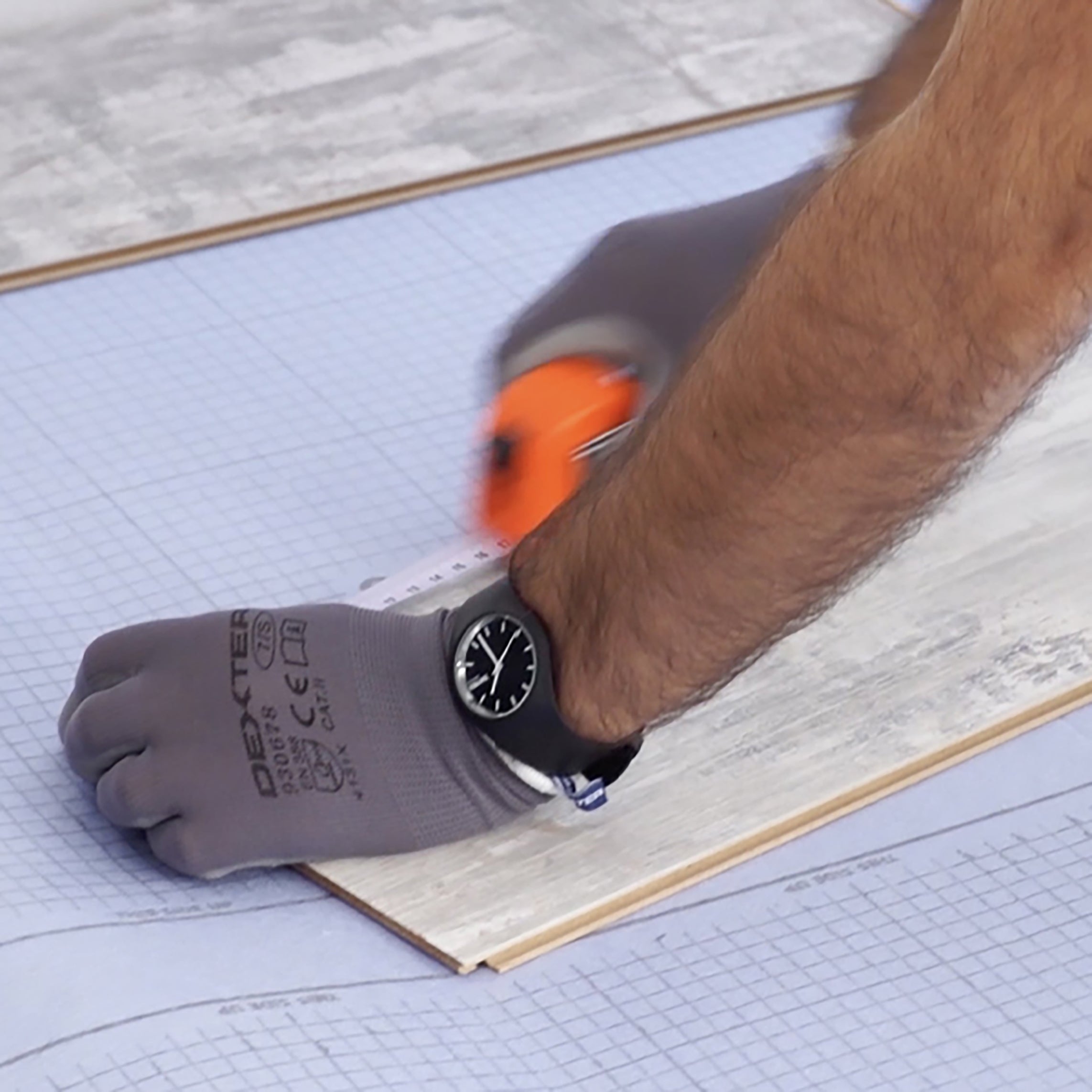 La linea di taglio: Per segnare la linea di taglio, misura la distanza tra la fine della doga senza linguetta e il muro e riportala sulla doga, partendo dal lato con la scanalatura: in questo modo mantieni l’incastro. Tieni conto anche dello spazio di dilatazione, da 5mm per lato.